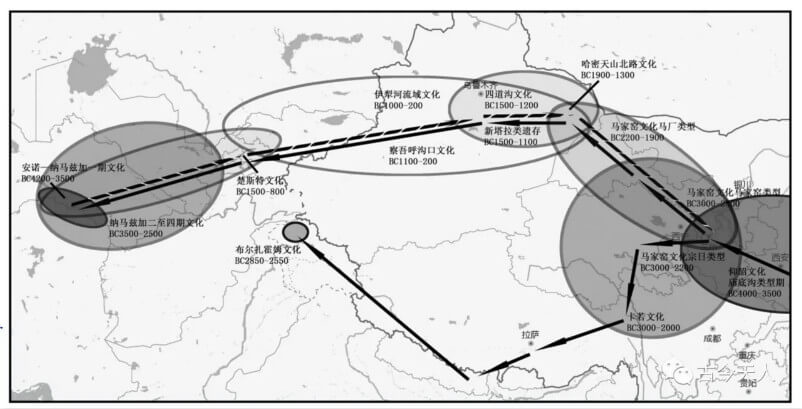 把这些彩陶的遗址连起来,从甘肃到河南,地理方位恰好是从西到东,于是,这就等于安特生提出了新一波的“中国文化西来说”,就是说,彩陶文化从西向东,先从新疆传播到甘肃,再从甘肃沿着黄河传播到河南,进而扩散到整个中国。