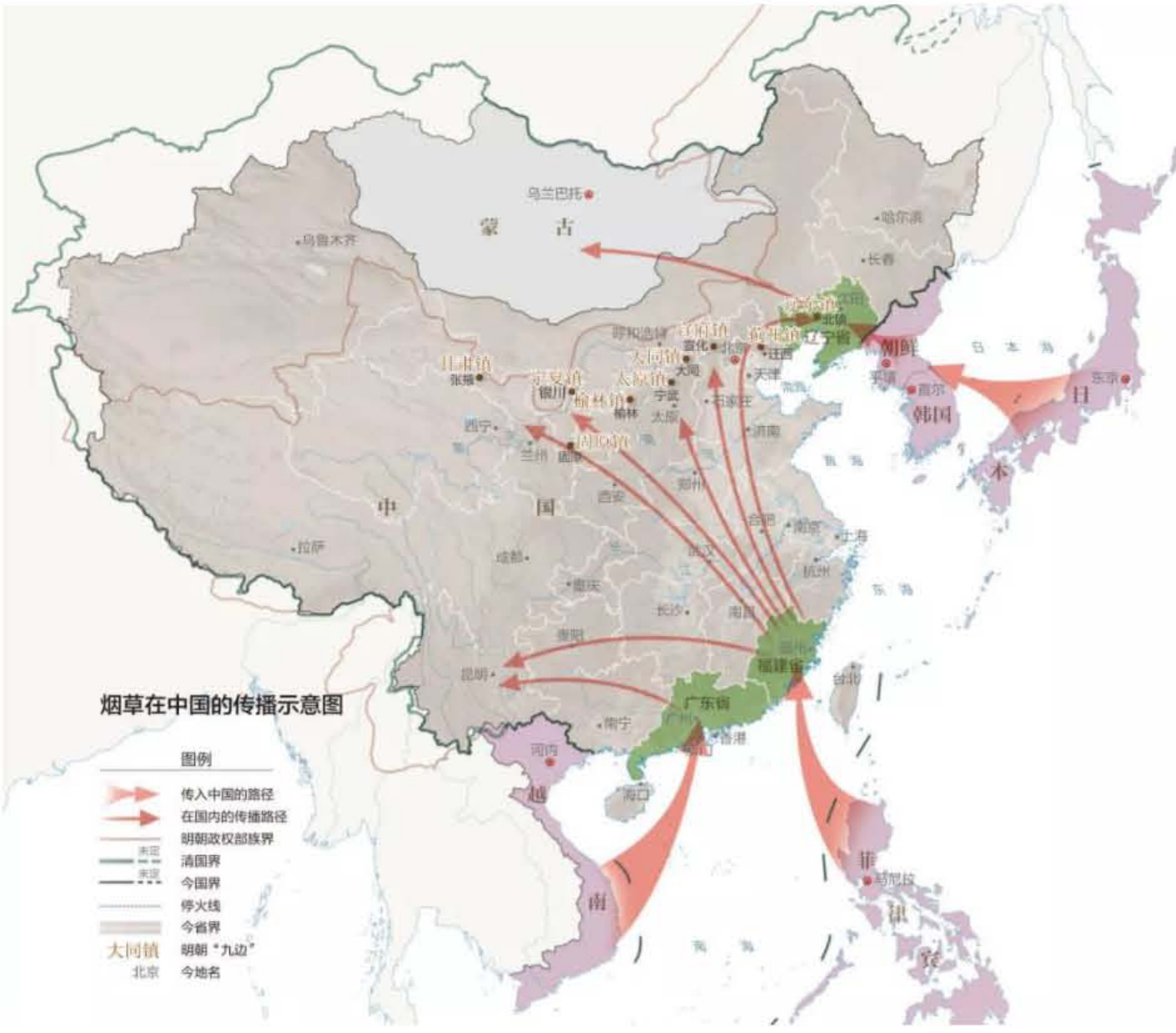 烟草在中国的传播示意图,共三条路线,还刻意标注了时代的九边