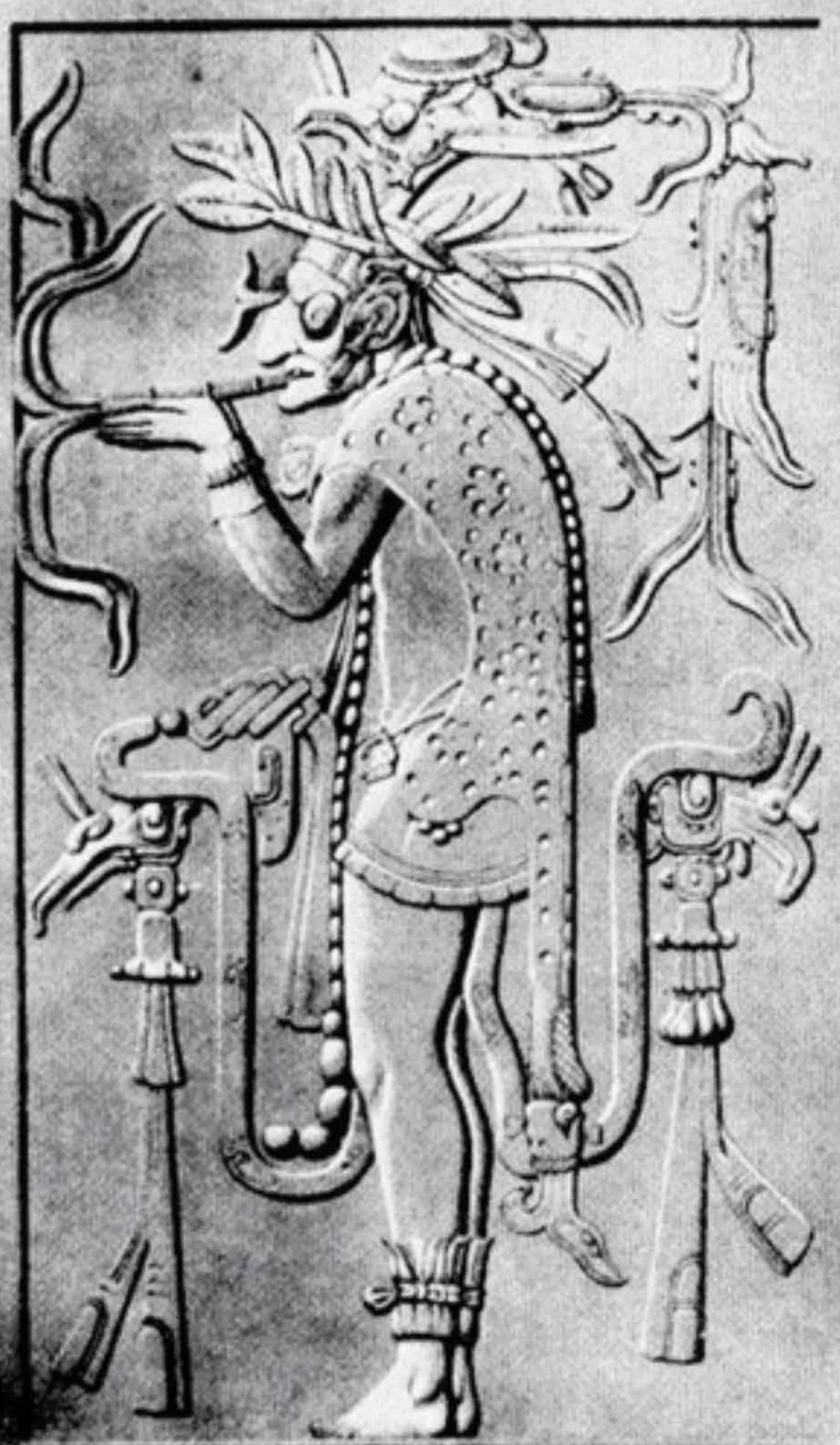 这块浮雕表现的是某种仪式上的玛雅人在吸烟。烟草的功能是造成神经亢奋,而且吸烟的时候烟雾缭绕,也显得神秘兮兮,还感觉飘飘然如神仙之概,所以美洲土著往往是在宗教仪式上使用烟草,等于人神沟通的桥梁,浮雕上吸烟的这个人应该是位祭司。哥伦布说,美洲土著的酋长和祭司,有时候甚至会吸烟吸到昏厥,真是好大的烟瘾。不过普通人一般不吸烟,他们嚼烟,把烟草叶子丢到嘴里嚼一嚼,效果也差不多,就只是没有喷雾的特效嘛。之前我们说美洲土著看到西班牙人骑马都被震惊了,旧世界的人,头一次看到美洲人吸烟,也吓坏了。
