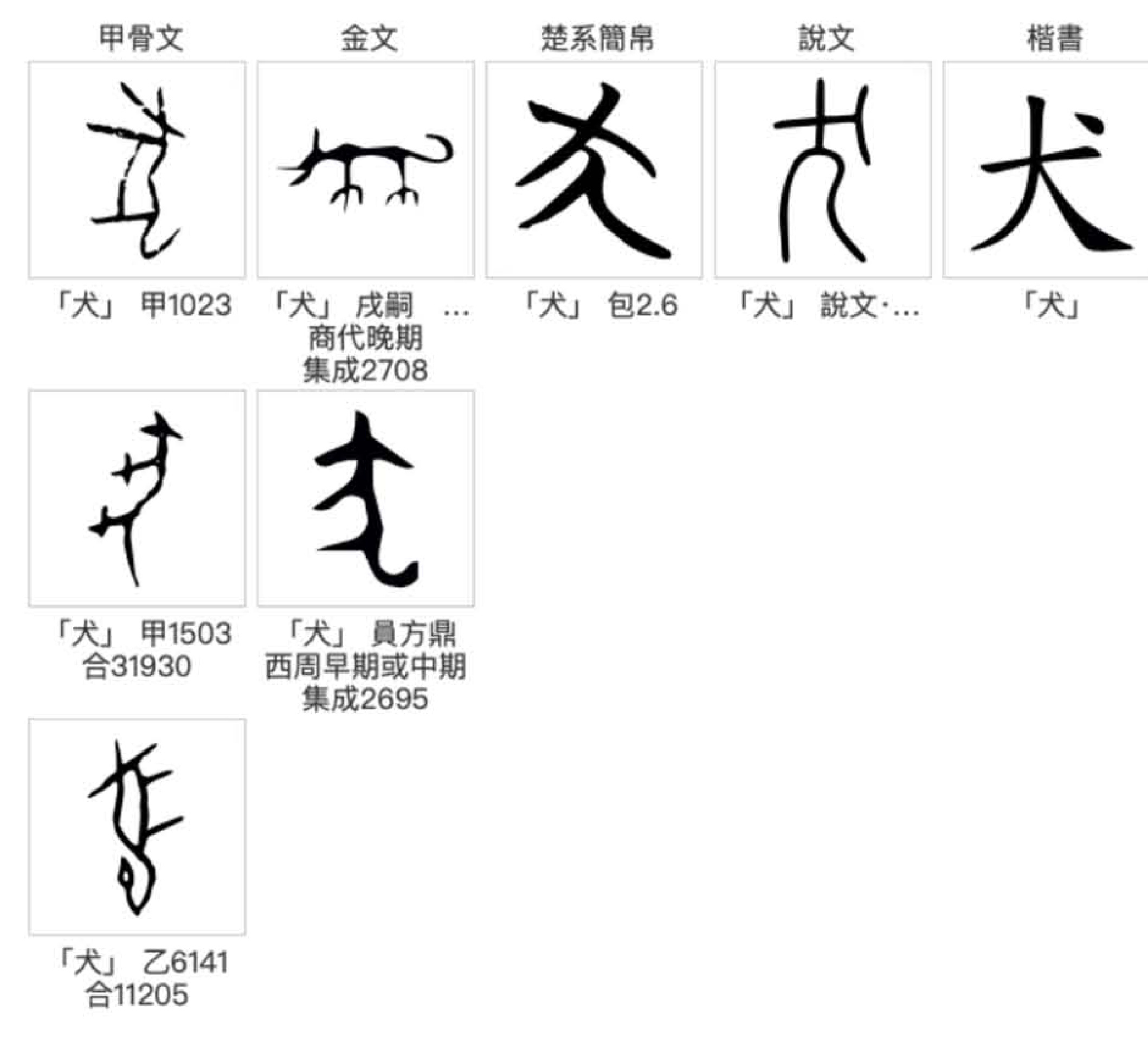 汉字发展到现在,其中象形部分的模样也变得越来越抽象。比方说,甲骨文里的“犬”字,活脱脱就是一只狗;到了金文和小篆,还勉强能看出个大概;之后的隶书、楷书,基本无法理解这个字跟狗的外形有什么联系了,犬字右上角不是有一点嘛,也看不出是狗脑袋还是狗尾巴。现代的简体字里勉强称得上象形的字,只有廖廖几个。