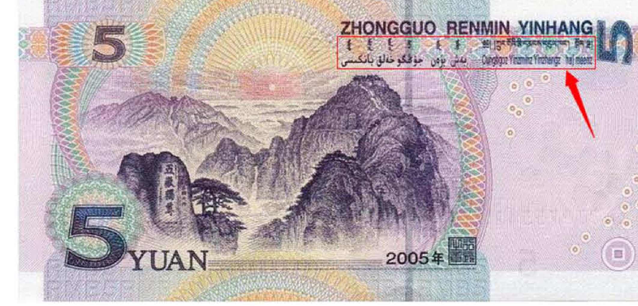 纸币人民币上,不算阿拉伯数字和盲文数字符号的话,一共有五种语言,五种半的文字。
